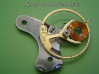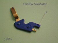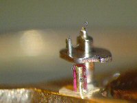 "A" is the terminal spring (conductor). The negative part of the cell (battery) touches this spring. The negative portion of the cell must not touch any other part of the watch or it will cause a short. The spring is insulated from the main plate by "b." "B" is positioned between the frame and train bridge. It functions as a pillar to space them apart. The two dowels or pins locate the contact assembly in the plate without the need for a costly bridge or screws. "C" is a L-shaped arm that may be adjusted to change where "d" makes contact with the metal contact pin "e" (above). When "d" touches "e" the switch is closed and the coil is energized. The polarity of this electromagnet kicks the balance wheel around until it is drawn back by the hairspring. Contact is made two times in one oscillation of the balance assembly.