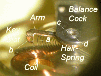 TIMEX INNOVATION:TRIANGULAR ARM---KEY SLOT Point "a" and "b" of Timexes KEY SLOT replaced the regulator pins found in many watches. When setting up a hairspring in a traditional watch, the hairspring is closely centered between the brass regulator pins without touching them. If the hairspring moves by gravity from point "a" (inside)to "b" (outside) then it will cause the watch to loose or gain time as the ACTIVE LENGTH of the hairspring has changed in the hairspring's motion from point "a" to "b" or "b" to "a".